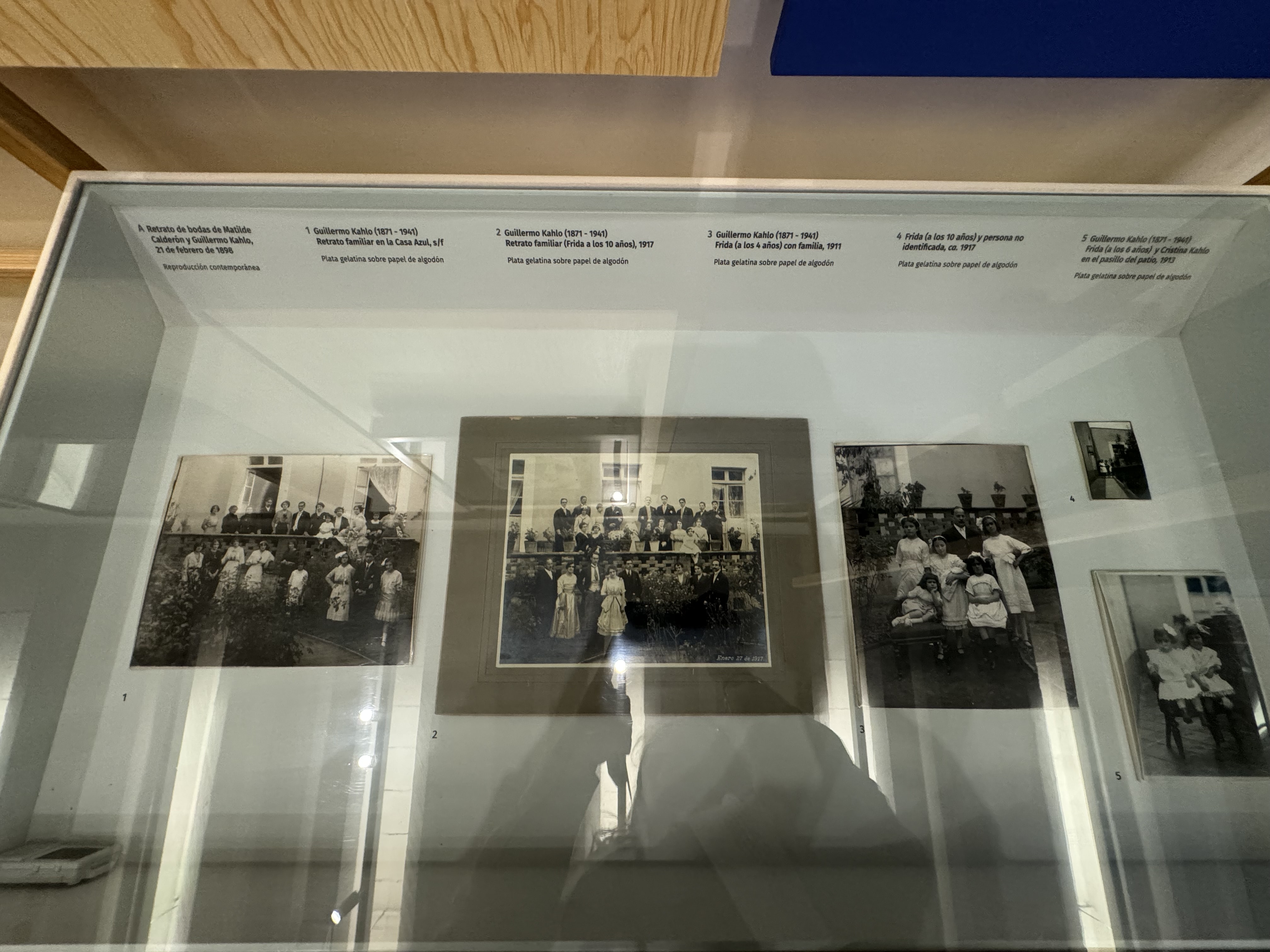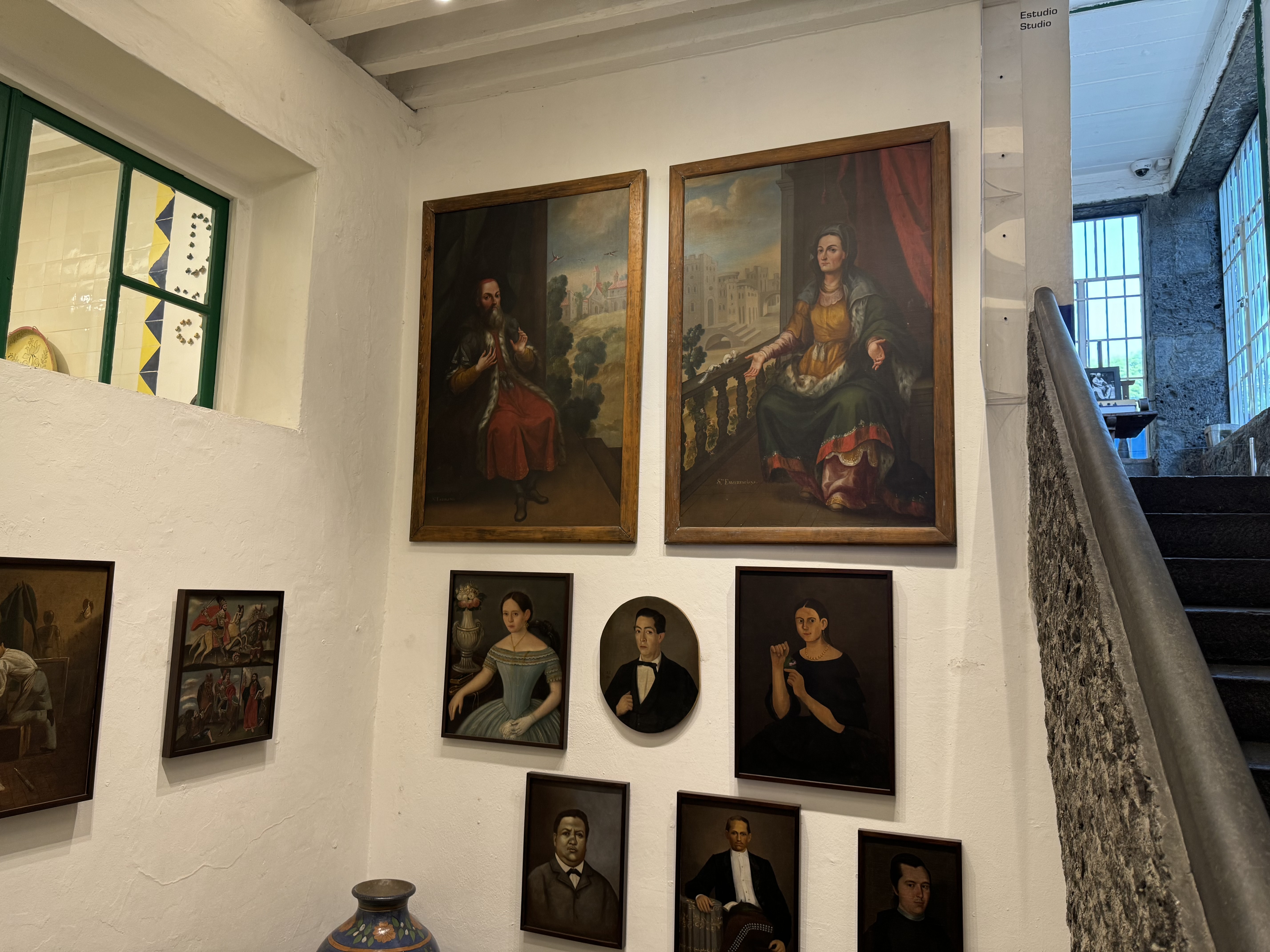 Avlu alanından üst kata çıkan merdiven boşluğunun olduğu yerde, Frida Kahlo’nun ailesine ait resim koleksiyonundan örnekler bulunuyor.