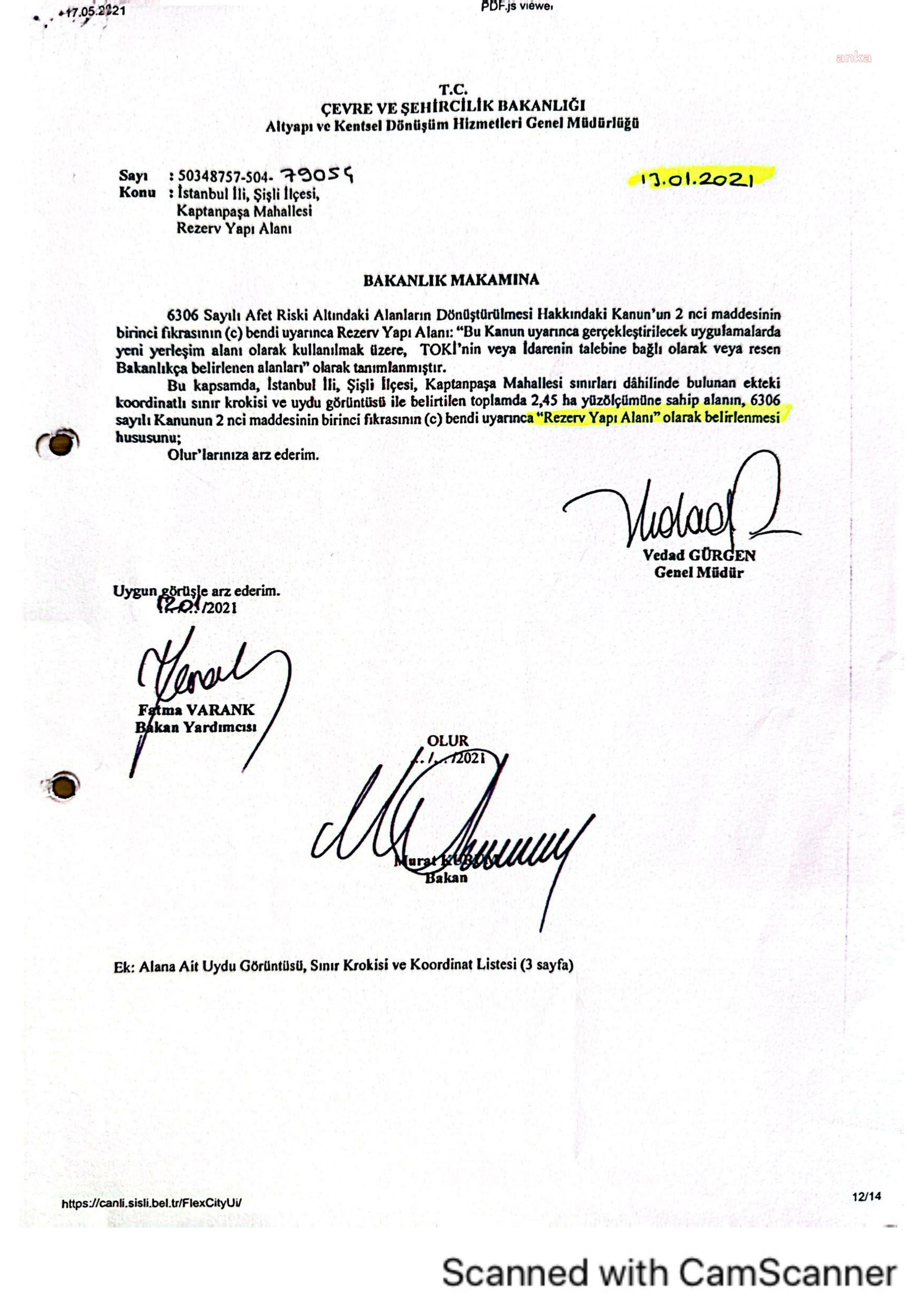 Sürece ilişkin bazı belgeleri aktaran Şahan, Cumhur İttifakı İBB Başkan Adayı Murat Kurum’un Çevre ve Şehircilik Bakanlığı yaptığı dönemde imza attığı ve rezerv yapı ilan edilen belgeyi göstererek şunları söyledi: